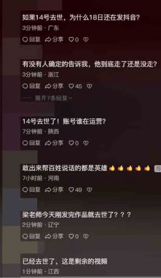 因为梁小龙的抖音账号,一直在持续的更新中,为此这件事情,引发不少网民的热议。还有人在留言区询问他人,梁小龙是否真的离世。