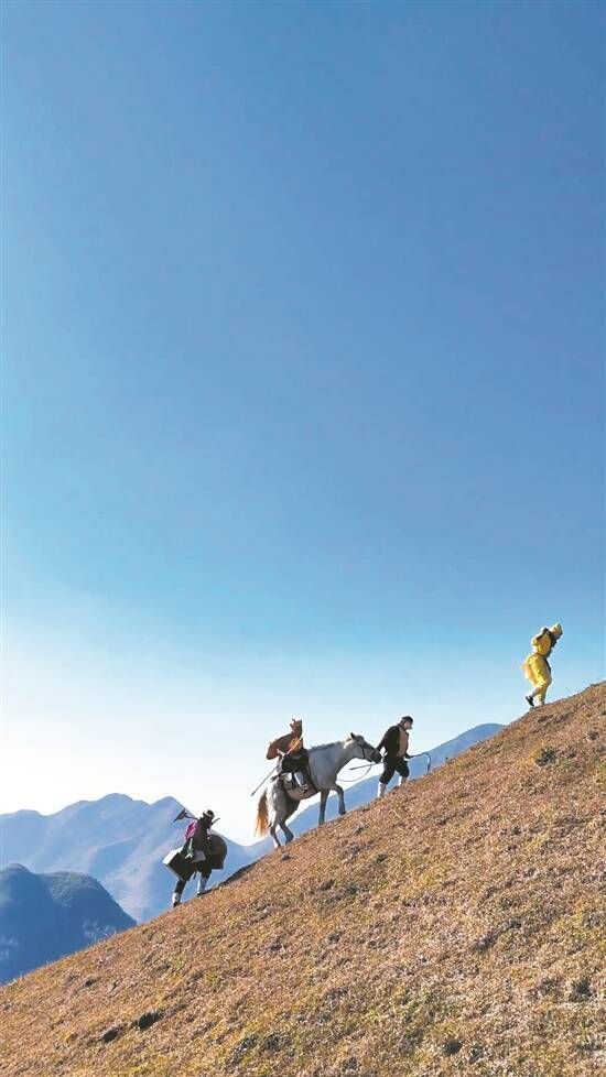 广西玉林北流平政镇,一条小径沿着丘陵往前延伸,两旁是微黄的草地,平时寂静少人。从去年开始,一支奇怪的队伍出现在这条小径上,有人戴着猴毛面具,有人顶着乳胶肚皮,有人挑着两个旧木箱,还有一个穿着袈裟的“唐僧”,骑一匹白马,念叨着:“好险,差点被妖精抓去煲汤。”他们沿着山路走,支起手机、放上音乐,走到哪儿,就拍到哪儿。