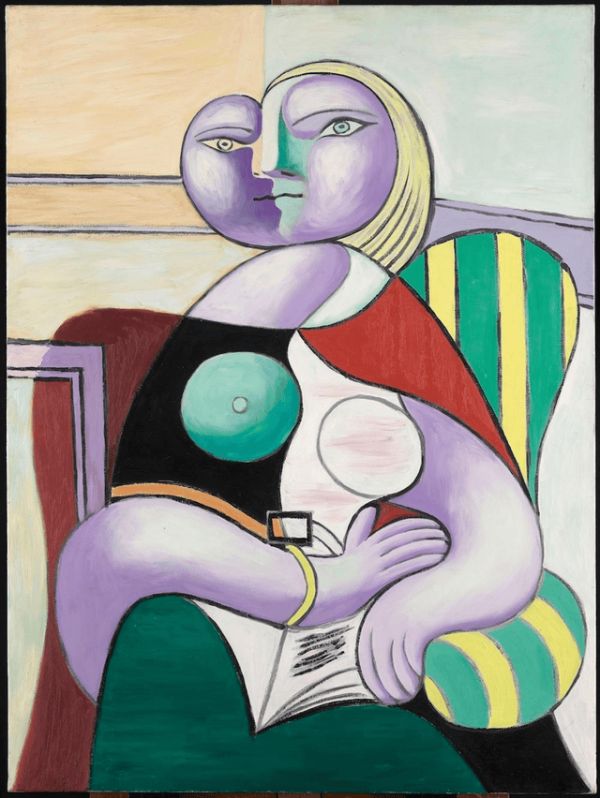《阅读》是毕加索以伴侣玛丽-特蕾兹·瓦尔特为灵感而创作的。画中女子似乎正沉浸于阅读所引发的神游之中,毕加索同时呈现了她的正脸与侧颜。身体的其余部分则由交织的线条和色块构成,仿佛与扶手椅融为一体。