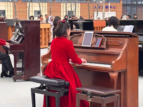 与常规演出场所不同,这次户外合奏选在景区一处停机坪上。近40台钢琴分两层呈环形摆放,中央是一架用于领奏的三角钢琴。有人单独演奏,有孩子双人联弹,大多数演奏者盛装出席,让这场寒冬里的音乐之约,既充满亲切感,又富有仪式感。