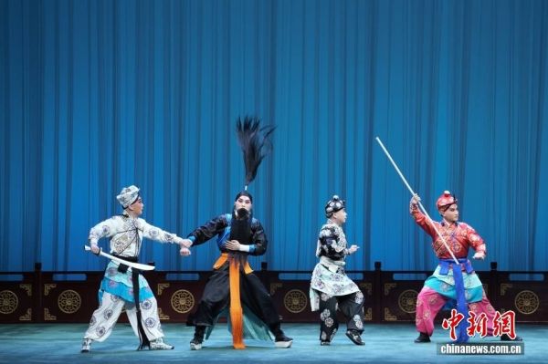 图为2月7日,刘恒(左二)演出《施公案·洗浮山》。图/CNSphoto 史春阳 摄