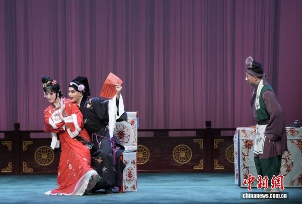 图为2月7日,刘恒(中)魏春荣(左)演出《救风尘·趱路讨书》。图/CNSphoto 史春阳 摄