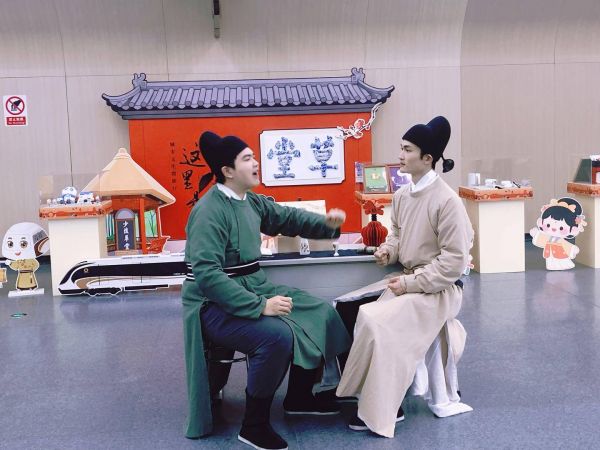 身着浅绿长衫的“李白”和身着浅黄长衫的“杜甫”,声情并茂地为现场路过的地铁乘客们,重现了一场著名诗人的“巅峰相见”——天宝三载(公元744年)夏,李、杜在洛阳相识,彼此欣赏,从此开始了二人的伟大友谊。杜甫写下《赠李白》——“秋来相顾尚飘蓬,未就丹砂愧葛洪。痛饮狂歌空度日,飞扬跋扈为谁雄?”