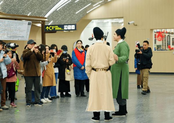 2月11日上午,成都地铁13号线杜甫草堂站的C出口站厅内,新春的喜庆氛围和古典的诗意氛围,通过两位“唐代诗人”的现场演绎,为一群群出站的旅客们带来惊喜。