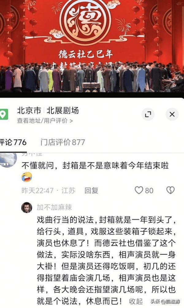 德云社虽以相声为主业,大褂便是唯一的"戏服",但仍郑重延续这一传统。封箱大典既是向观众宣告"放假了",也是一场面向全体成员的"年终团建"。不过,在互联网时代,"封箱"更多是象征意义——演员们虽不再举办线下商演,却仍会现身各卫视春晚,通过屏幕继续为观众送去欢笑。