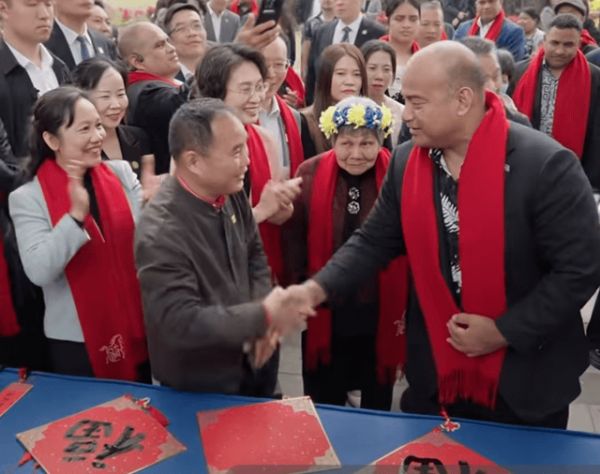 阿迪昂总统在活动后表示,此次书法体验让他深刻感受到了中华文化的博大精深,也进一步加深了对祖籍地的情感认同。活动现场,他还特意用刚学会的粤语向乡亲们送上“新年好”的祝福,并按照当地年俗,化身瑙鲁“财神爷”,向族亲派发红包,与乡亲们同享新春喜悦,将现场节日气氛推向高潮。