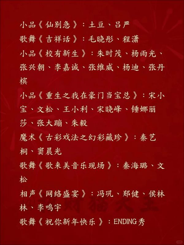 最后提醒大家,节目单含部分剧透,实际播出可能会有微调,,正月初一 19:30,你准备好蹲守这场笑点密集的电子年夜饭了吗?最期待哪个节目?评论区聊聊!