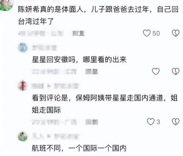 除了陈妍希母子外,与他们一同现身的还有阿姨以及男性工作人员,而在评论区有网友透露称带着儿子现身机场的陈妍希,母子两个并不是要一起回台湾省过年,有网友就看到阿姨带星星走国内通道,陈妍希走的国际,由此猜测,小星星这是要回爸爸陈晓老家安徽过年,而陈妍希独自返台过春节,大赞陈妍希真是体面人。