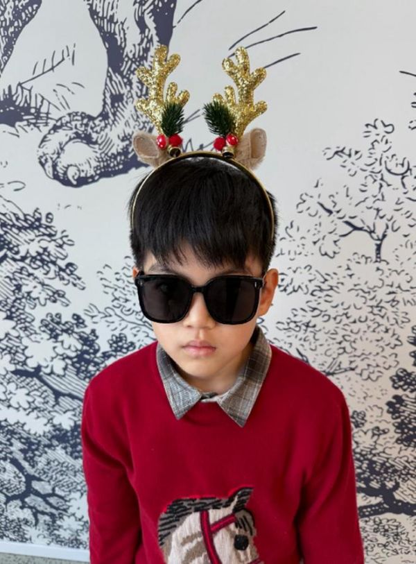 再看小星星,闭着眼睛睡觉的他脸上戴了白色口罩,一头黑色顺毛短发显得乖巧可爱。从小星星露出的眉眼来看还是更像爸爸陈晓。而相比妈妈,穿着一件黑色短款羽绒服的小星星,保暖性更好。