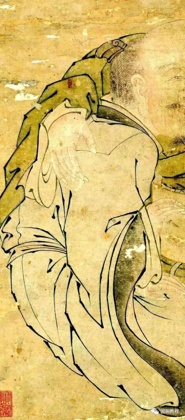 此幅粗看似一笑面弥勒盘腿而坐,体态浑圆,细看却是三人合一。左首为一着道冠的老者;右首为一戴方巾的儒士,二人各执经卷一端,团膝相接,相对微笑。第三人则手搭两人肩上,面部被遮,只露出光光的头,一手轻捻佛珠,是佛教中人。构图合三人为一体,“霭一团之和气 ”,精妙绝伦。人物刻画生动传神,衣纹细劲流畅,顿挫自如,显示出画家的匠心巧思与高超技艺。