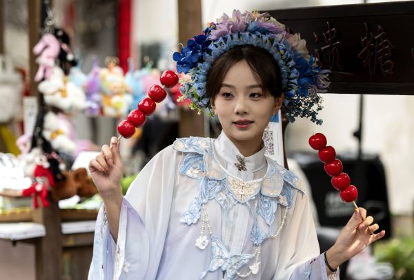 2月17日,一名游客头戴簪花在福州三坊七巷风雨长廊打卡留影。 新华社记者 魏培全 摄