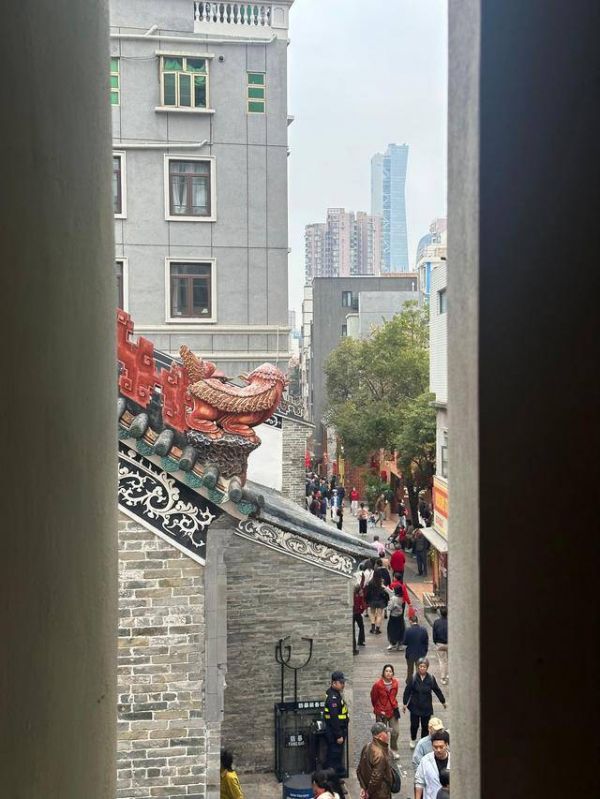 在龙岗区的甘坑古镇,同样是一派人潮涌动的热闹景象。青石板路上,身着汉服的年轻姑娘们手持团扇,在人群中穿梭拍照。古镇内,潮汕布马舞、古风鱼灯巡游等非遗项目轮番上演。这座拥有三百多年历史的客家古村落,今年春节期间推出“甘坑骐遇年”主题活动,围绕马年年俗打造非遗互动体验、笼灯舞等非遗表演、年俗大巡游。