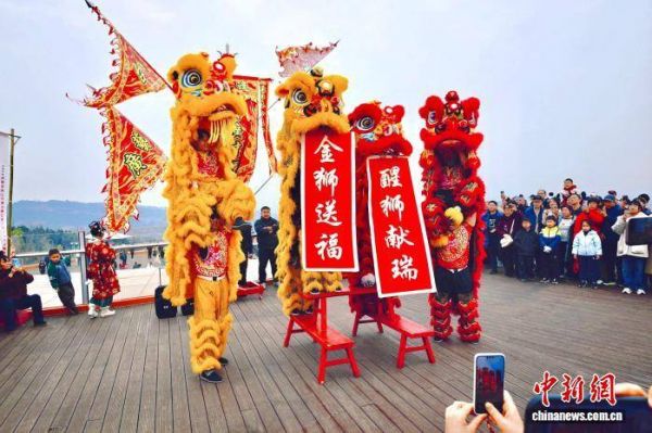 活动现场,成都东部新区余门拳团队带来的高难度舞狮表演精彩纷呈,与“敲鼓祈福”等传统年俗活动交相辉映,整个景区充满喜庆祥和的节日氛围。