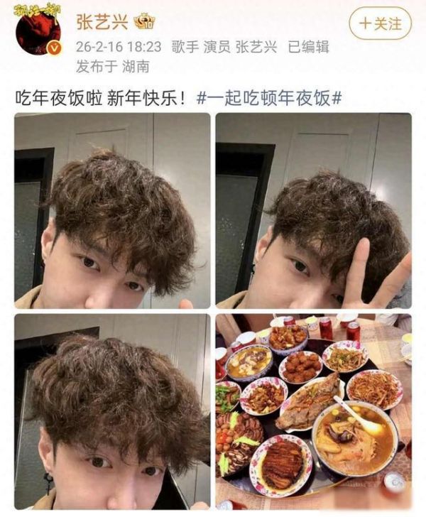 2026年2月16号是除夕夜,张艺兴在社交平台发了照片和视频,他没有化妆,头发留着自然卷,稍微有点乱,还用手比了个耶的手势,背景是家里的餐桌,上面摆着几道家常菜,看起来普普通通,但是冒着热气,挺有生活气息,配文只有一句:吃年夜饭啦,新年快乐。