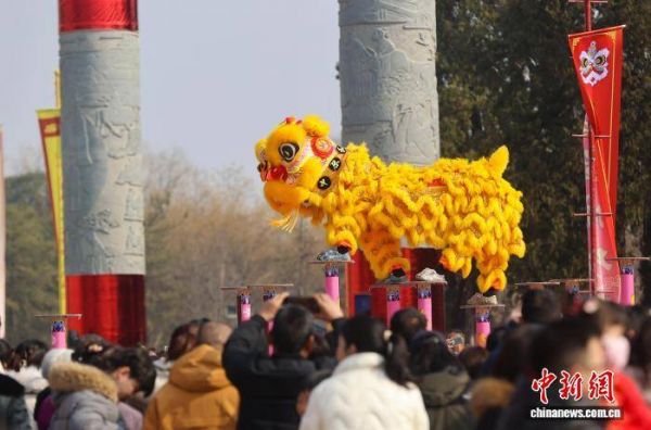 2月17日,河南省三门峡市灵宝函谷关历史文化旅游区新春大庙会吸引众多游客,舞狮、杂技、互动游戏……丰富多彩的活动营造出浓浓的年味。图为舞狮表演吸引游客。孙猛 摄