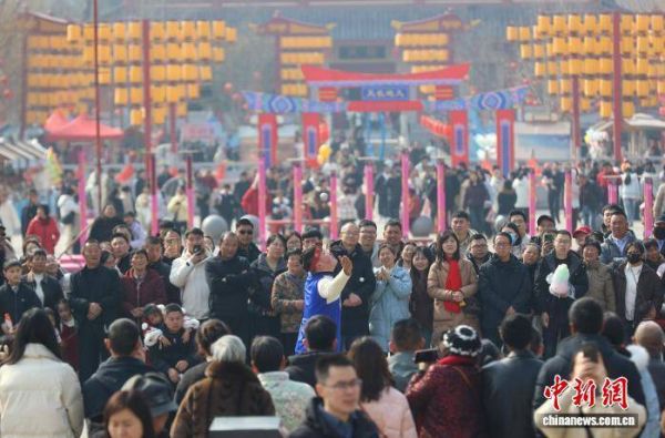 2月17日,河南省三门峡市灵宝函谷关历史文化旅游区新春大庙会吸引众多游客,舞狮、杂技、互动游戏……丰富多彩的活动营造出浓浓的年味。图为庙会上游客众多。孙猛 摄