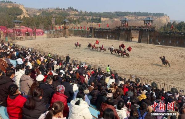 2月17日,河南省三门峡市灵宝函谷关历史文化旅游区新春大庙会吸引众多游客,舞狮、杂技、互动游戏……丰富多彩的活动营造出浓浓的年味。图为精彩的节目表演吸引众多游客。孙猛 摄