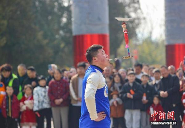 2月17日,河南省三门峡市灵宝函谷关历史文化旅游区新春大庙会吸引众多游客,舞狮、杂技、互动游戏……丰富多彩的活动营造出浓浓的年味。图为庙会上的杂技表演。孙猛 摄
