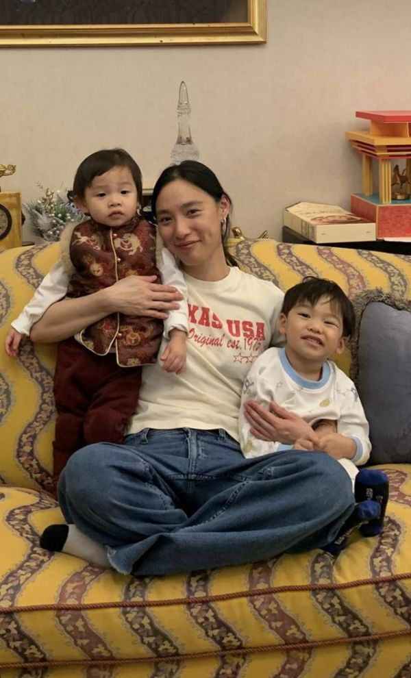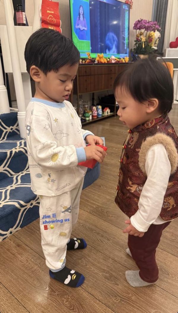 应采儿同俩儿子晒拜年照 穿中式红色马甲恭贺新年