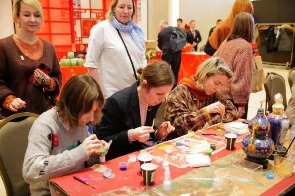 图为俄罗斯民众在“欢乐春节”专场活动现场体验传统手工艺项目。北京市文化和旅游局供图