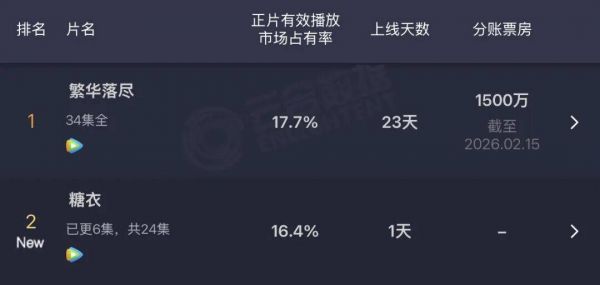 在猫眼短剧热度榜上,《糖衣》同样表现亮眼,超越《太奶4》登上榜首。虽然横屏和竖屏不好直接比较,但也是一种参考维度。