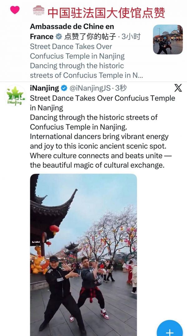 春节期间,iNanjing发布《南京夫子庙千年文脉邂逅潮流街舞》视频,鲜活展现潮流文化与南京传统地标的碰撞,获中国驻法国大使馆点赞,视频中的两位外国舞者也参与评论,成为中外文化交流的亮眼瞬间。iNanjing发布的系列春节民俗内容,如《来南京,全城偶遇“福”窗》视频,获中国驻德国大使馆点赞;通过图文介绍高淳国际慢城非遗活动,获得韩国国际慢城账号关注并点赞。