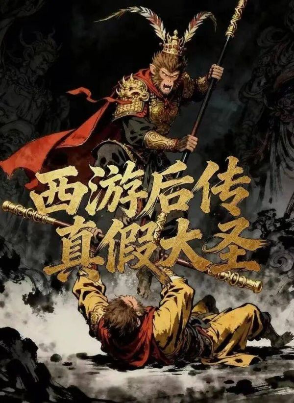 很明显,这是基于《西游记》经典桥段“真假美猴王”进行的二创,而且属于“阴谋论”式的暗黑改编。从画风来看,作品的水墨质感较强,黑金二色为主,显得压抑却不失庄严,符合这种“黑神话”的基调。
