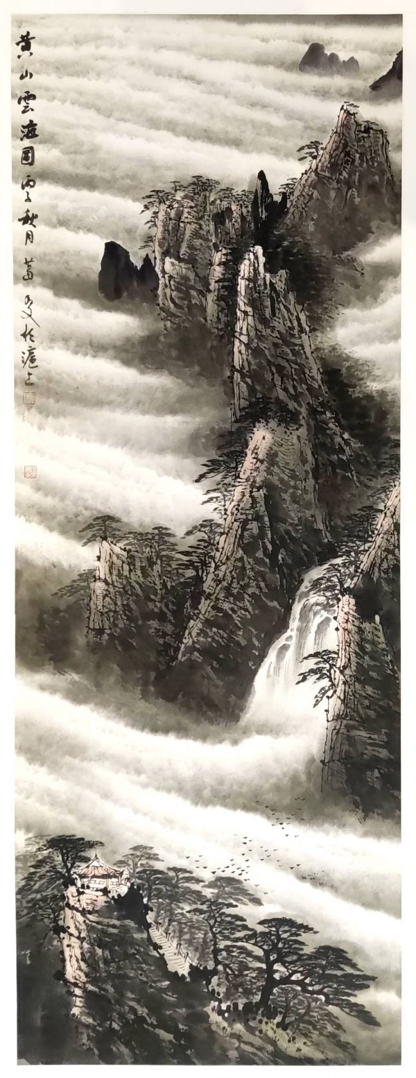 整幅画通过“实”的山石、飞瀑、古亭与“虚”的云海、远山的对比,构建了一个既真实可感又空灵缥缈的艺术世界,让观者仿佛置身于黄山之巅,感受天地之辽阔,宇宙之无穷。