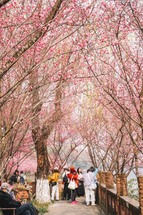 “锦江春色早,望江梅韵浓。”春节前夕,望江楼公园推出“望春风”杏梅主题活动,邀请市民、游客在杏梅花下共迎新春。绵延一公里的杏梅长廊是这个春天最动人的景致,上千株杏梅次第绽放,粉白相间的花簇缀满枝头,倒映在粼粼锦江水面,与朱红古建、苍翠修竹构成一幅立体的春日画卷。