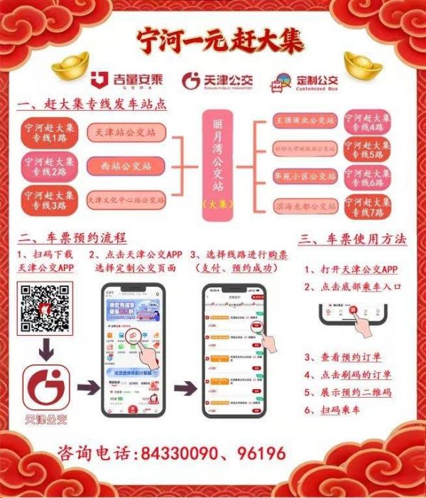 为方便市民出行,大集开通1元定制公交专线,市区设天津西站、天津站、文化中心、财经大学地铁站、王顶堤北、华苑小区6大始发点,滨海新区新增滨海龙都小区始发线路,实行网上预约、一人一座、拼团发车。市区发车时间为8时,返程时间为14时,市民可通过“天津公交APP”预约购票。同时,大集周边设置百亩免费停车场,方便自驾市民停放车辆。