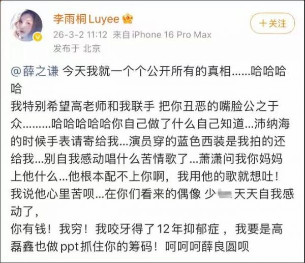 李雨桐喊话薛之谦要求双方举证