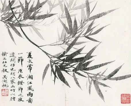 (八)夏太常湘江风雨图一节。庚辰灯节之夜,遣闷仿元明八家画竹,以赠榆生社兄教。吴湖帆。