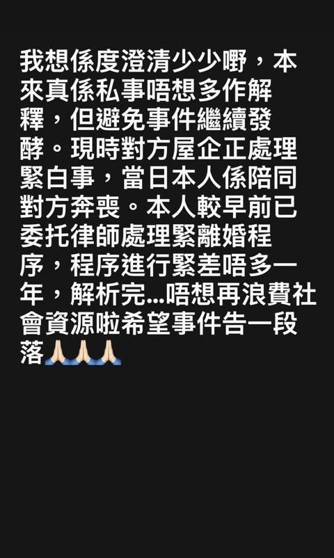 陈薇称想借此机会澄清一些事情,主要是避免事情继续发酵,对于早前与周永恒在地铁车厢被拍到一起,陈薇坦言当时实际上是陪着对方去奔丧,而她本人在较早之前已经委托律师处理离婚的程序,差不多也有一年多的时间了。