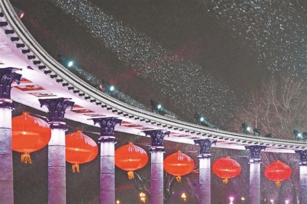 当日,鹅毛大雪悄然洒落,覆盖中央大街、松花江畔、中华巴洛克历史文化街区等景区的各式花灯。红灯笼覆上薄雪,愈显艳丽;冰雕彩灯与雪相映,光影梦幻,将雪的清冽与灯的暖辉完美融合,整座城市宛如一幅雪景灯画。(纪勇 记者 张澍摄)