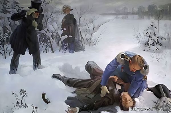 丹特士的子弹击碎了普希金的股骨,并进入腹腔。他倒下,失去意识,随后又自行苏醒。而此时副手们做了什么?他们先是粗暴地拖着骨盆受伤的普希金在雪地上前行,之后仿佛才反应过来,将他放在军大衣上抬向雪橇。随后便是在颠簸不平的道路上漫长的路程。