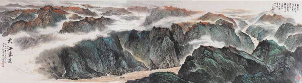 《大江东去》采用了典型的中国山水画“三远法”与“散点透视”,将千里三峡浓缩于咫尺之间。画面以横向长卷展开,近景是壁立千仞的峡江峭壁,中景是蜿蜒流淌的长江与点点帆影,远景则是层峦叠嶂、云蒸霞蔚的群山。这种构图方式,既继承了北宋山水“以大观小”的全景式传统,又融入了现代视觉经验,通过强烈的空间纵深感,营造出“大江东去,浪淘尽”的历史厚重感。