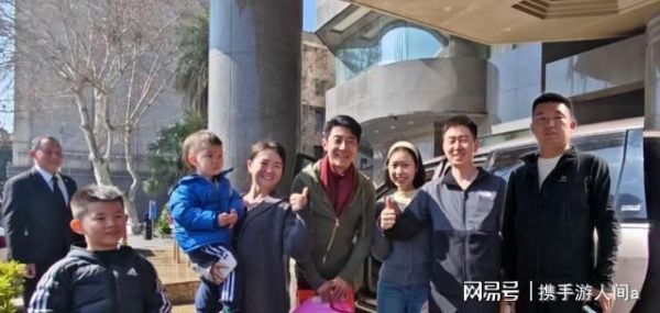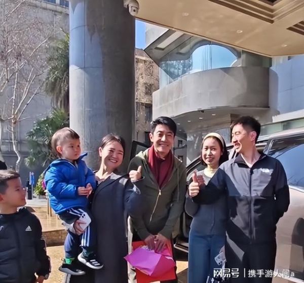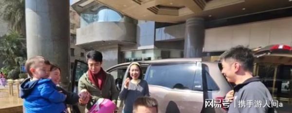 撒贝宁携妻儿武汉酒店合影,身高180微屈身显亲和态度