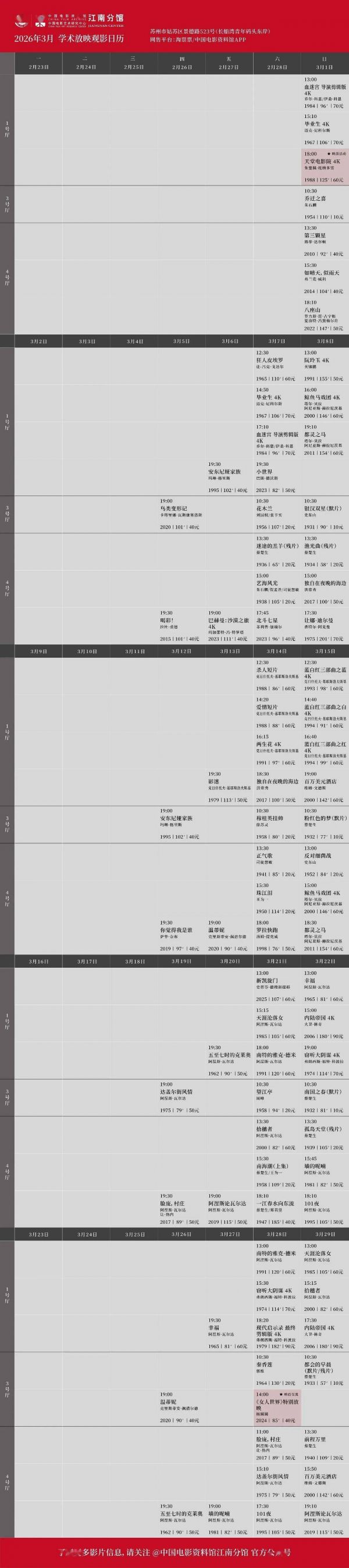 苏州江南分馆3月放映不光有大卫·林奇、科波拉大师经典首发,还有基耶斯洛夫斯基、阿涅斯·瓦尔达纪念专题早于北京进行展映,期待大家的光临。为更好服务影迷,4月起江南分馆排片将有进一步优化,有望增加工作日惠民场次,带给影迷朋友更多惊喜。