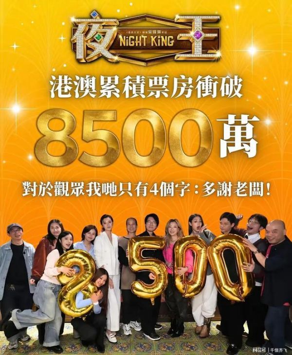 【影讯】吴炜伦导演,黄子华和郑秀文领衔主演,谢君豪、王丹妮、廖子妤、杨伟伦、卢镇业、何启华和杨思泳等主演喜剧片《夜王》凭借良好的口碑票房一路走高,截止目前中国大陆票房达到1.82亿人民币,中国香港票房超过8500万港币,马来西亚票房突破1000万令吉,北美、英国、卢森堡、荷兰、澳大利亚、新西兰和新加坡等市场上映全球累计总票房突破5600万美元。随着影片取得票房口碑双丰收的成绩,业内人士王晶、杨采妮、刘青云、吴镇宇等都对电影进行高度评价!