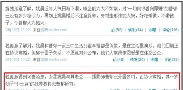 爆料里把分居原因说的有鼻子有眼,说一方面姚晨生完孩子后事业陷入低谷,俩人因此攒了不少矛盾。另一方面姚晨过去的一些八卦传到了曹郁耳朵里,让他心里一直有解不开的疙瘩。最出圈的说法,就是曹郁疑似出轨了姚晨的闺蜜。