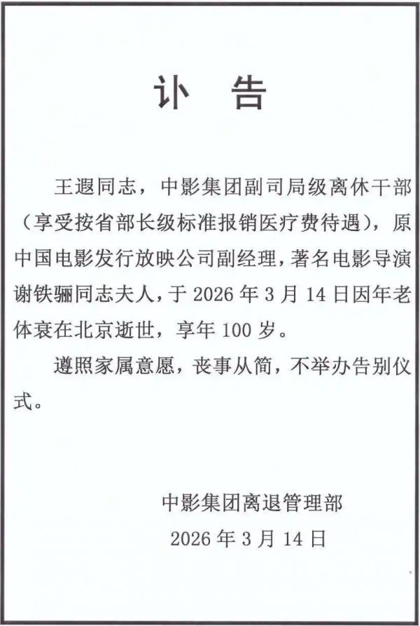 2026年3月14日,中影集团离退管理部发布讣告,沉痛宣布:原中国电影发行放映公司副经理、著名导演谢铁骊的夫人王遐,于2026年3月14日因年老体衰在北京逝世,享年100岁。