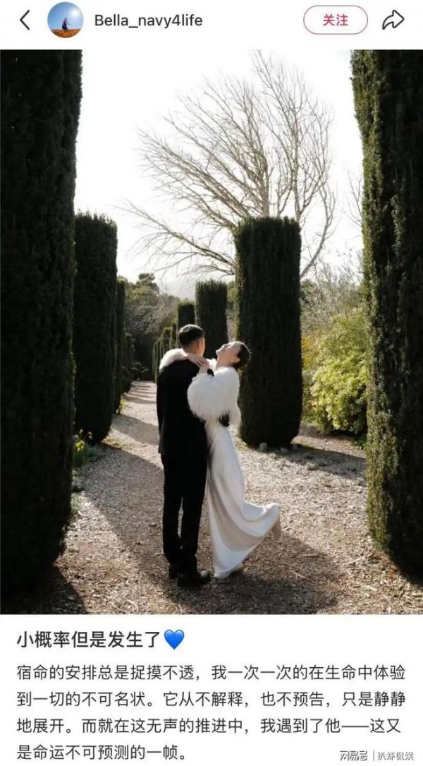 Bella官宣结婚时,发布很长一段文案,其中不乏对老公的赞许,称是他陪自己走过每一个高低起伏,老公是她最大的支持。