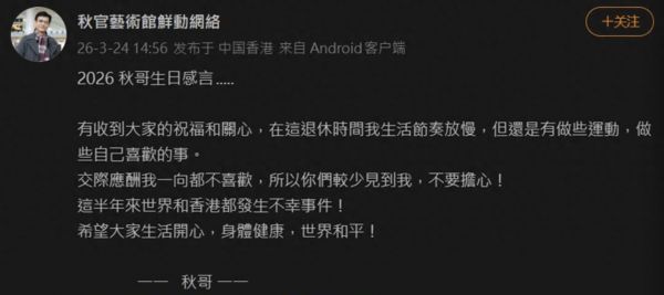 郑少秋在农历生日这一天,在一个名为“秋官艺术馆现动网络”的账号上发布了一则署名为“秋哥”的留言。郑少秋在留言中写道“有收到大家的祝福和关心,在这退休时间我生活节奏放慢,但还是有做些运动,做些自己喜欢的事。交际应酬我一向都不喜欢,所以你们较少见到我,不要担心!这半年来世界和香港都发生不幸事件!希望大家生活开心,身体健康,世界和平!”。