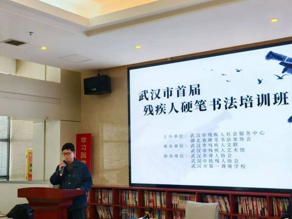 这是武汉首次专门为残疾人开设的硬笔书法业余培训班,由湖北省硬笔书法家协会与武汉市残疾人社会服务中心联合举办。