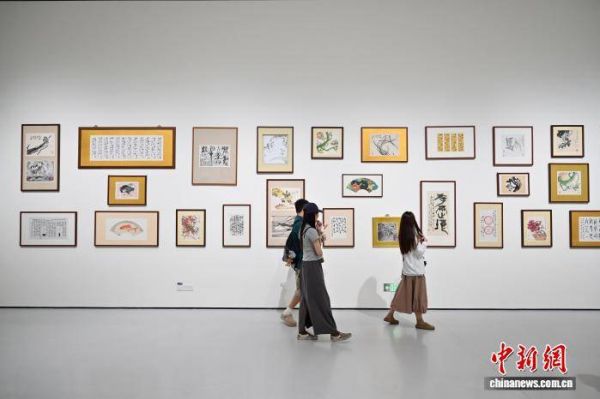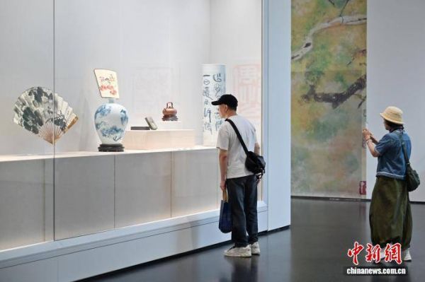 3月27日,“沐露岭南——韩天衡艺术回顾展”开幕式在位于广州市荔湾区的广东美术馆新馆举行。此次展览遴选了韩天衡不同创作阶段的240余件作品,包括金石篆刻、书法绘画、理论专著和手稿笔记等,展示艺术家八十载笔耕不辍的探索。图为展览吸引参观者。中新社记者 陈楚红 摄