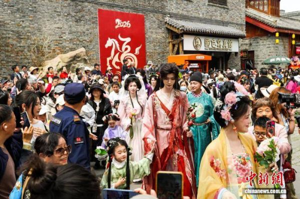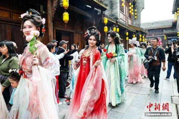 3月28日,湖北武汉,游客身着传统服饰参与花朝节巡游活动。当日,第七届汉口里花朝节在武汉园博园正式启幕,现场开展祭花神、传统服饰巡游、古风展演及民俗体验等内容。中新社记者 张畅 摄