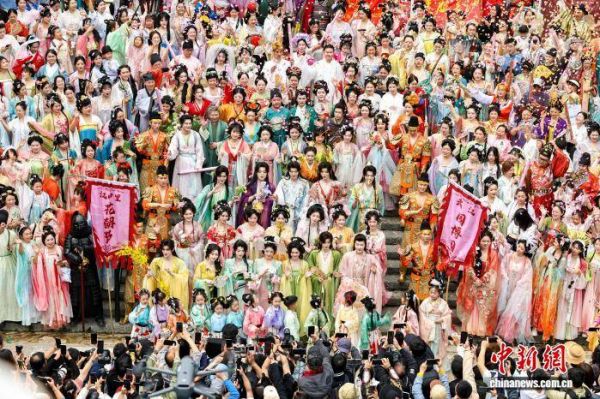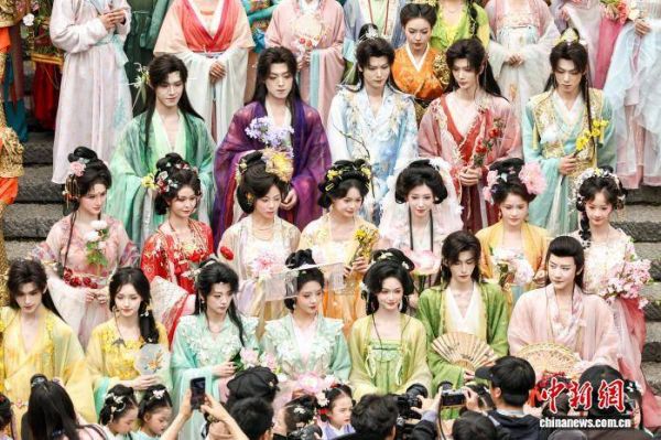 3月28日,湖北武汉,身着传统服饰的游客们巡游完后一起集体合影。当日,第七届汉口里花朝节在武汉园博园正式启幕,现场开展祭花神、传统服饰巡游、古风展演及民俗体验等内容。中新社记者 张畅 摄