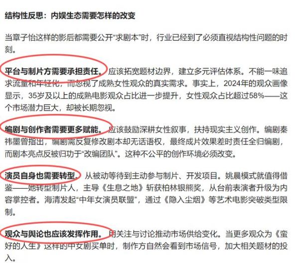 首先,平台和制片方要承担责任,不能一味追求年轻流量,要给女演员机会,建立多元评分体系,什么叫多元评分体系呢,我的理解是好莱坞那样,一部戏必须要有30%大龄女演员,戏份占比必须达到多少。