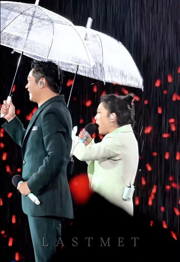 本来好好的晴天,唱到第四首歌的时候突然变天,豆大的雨点劈头盖脸砸下来,没一会儿整个体育场全湿透了。内场观众一下子慌了神,不少人本能往能躲雨的地方跑,场面一度有点乱糟糟。工作人员赶紧冲上台给俩人递了透明伞,换别的艺人说不定直接停演,或是躲在伞下应付完事。凤凰传奇偏不,曾毅上来就给所有人整了个出乎意料的活。
