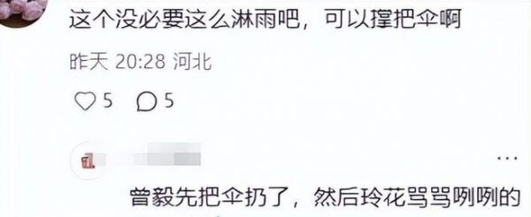 纠结了三秒钟,玲花咬咬牙也把伞扔了出去,那模样活像是被损友拉着干坏事,自己不情愿但还是认了,反差感直接拉满。没了雨伞遮挡,暴雨没一会儿就把俩人浇成了落汤鸡,玲花的头发衣服全都贴在身上,脸上的精致妆容也被雨水冲花,眼线眼影全晕开,雨水顺着脸颊往下淌。这一幕被现场观众拍下来发到网上,评论区直接笑疯了,全在说曾毅现在越来越敢带偏玲花了。